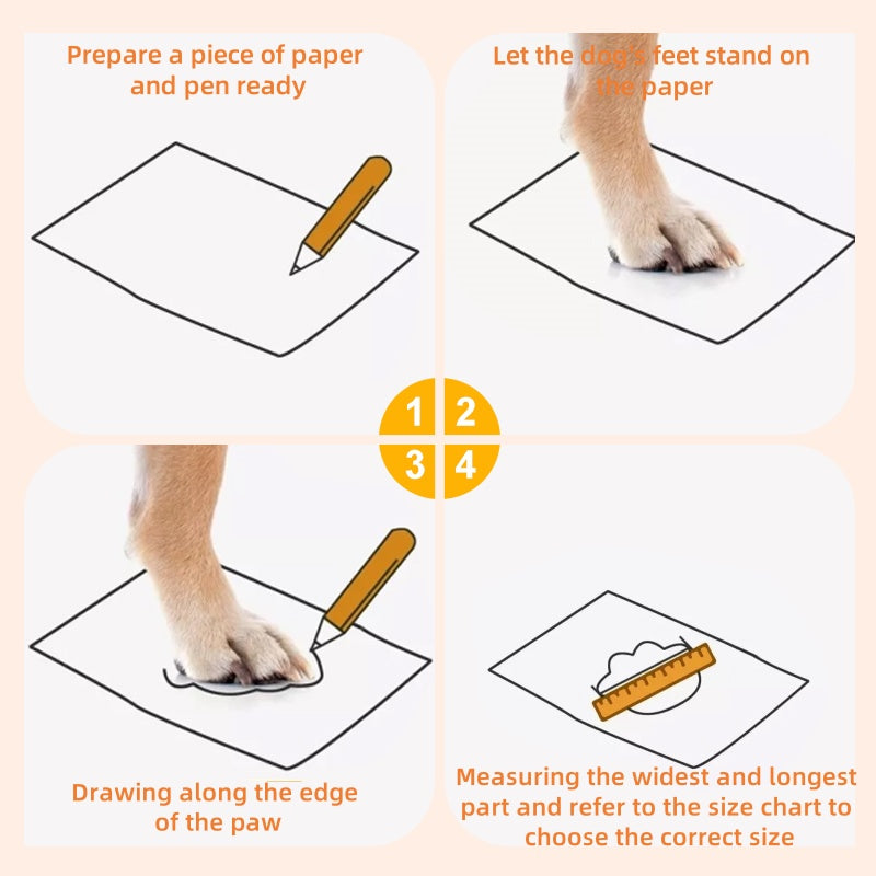 MAATKEUZE: Om de juiste maat te bepalen, laat u uw hond op papier staan, tekent u lijnen rond de poot en meet u het breedste deel. Kies voor comfort een maat die iets breder is dan de exacte pootmaat.