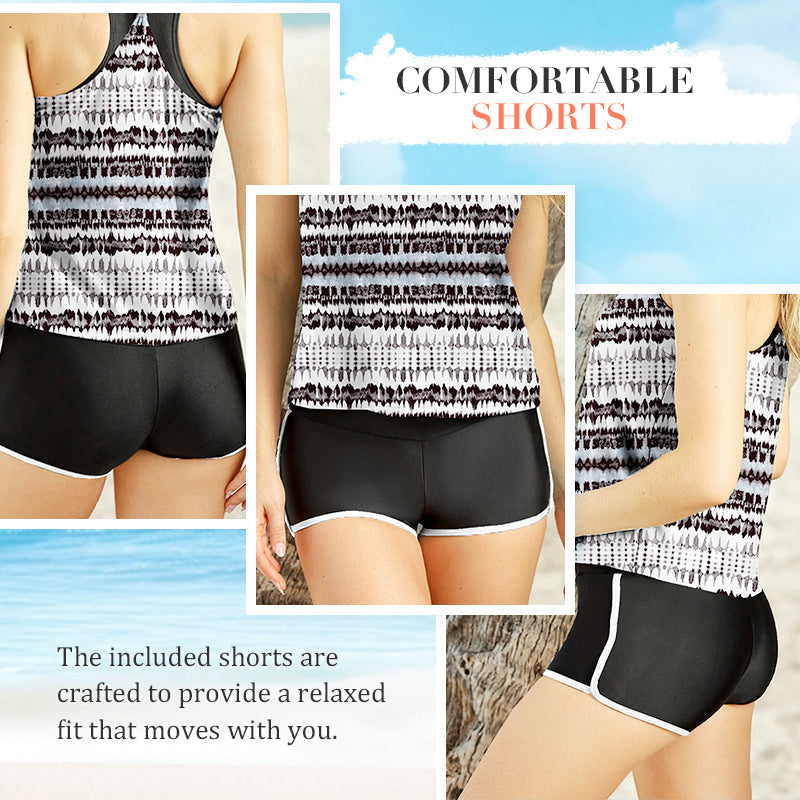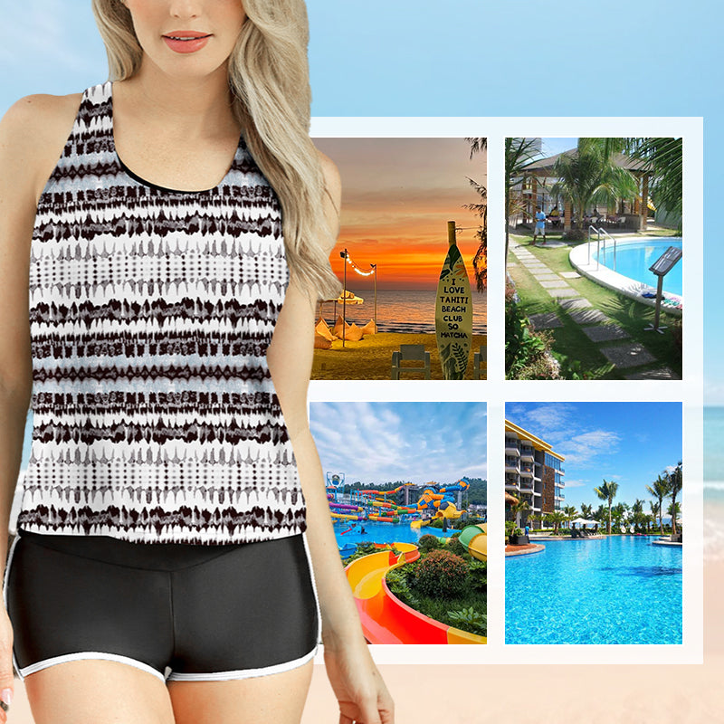 GEPRINT TANKTOPJE - Het stijlvolle geprinte tanktopje biedt bescheiden bedekking en een flatteuze pasvorm. De levendige patronen voegen visuele aantrekkingskracht toe, waardoor deze set veelzijdig is als strandkleding of voor casual uitjes. Het ademende materiaal houdt je koel en comfortabel in de zon.